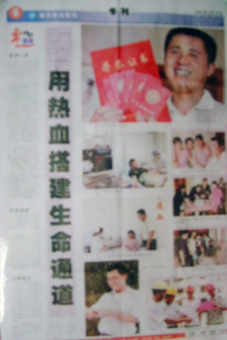 2006年初,他的献血总量突破了10000毫升而成为了我市的"无偿献血状元"。当年3月14日在举行的35岁生日聚会,当他从市中心血站领导手中接过"鄂州市无偿献血状元"锦旗时,激动地说:"我只不过是怀着感恩的心去做了一件力所能及的事,组织就给了我这么高的荣誉,我当更加倍努力,去争当湖北的献血状元,为更快地促进我市的无偿献血事业而尽心竭力!"